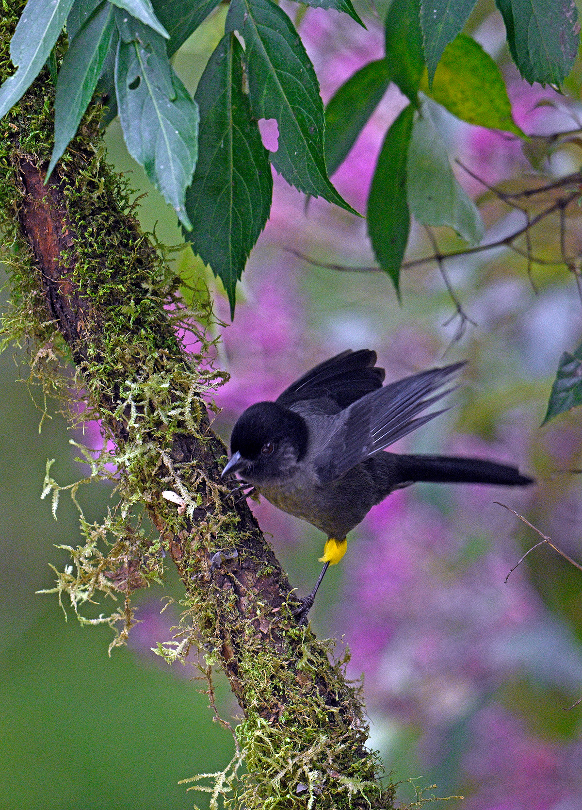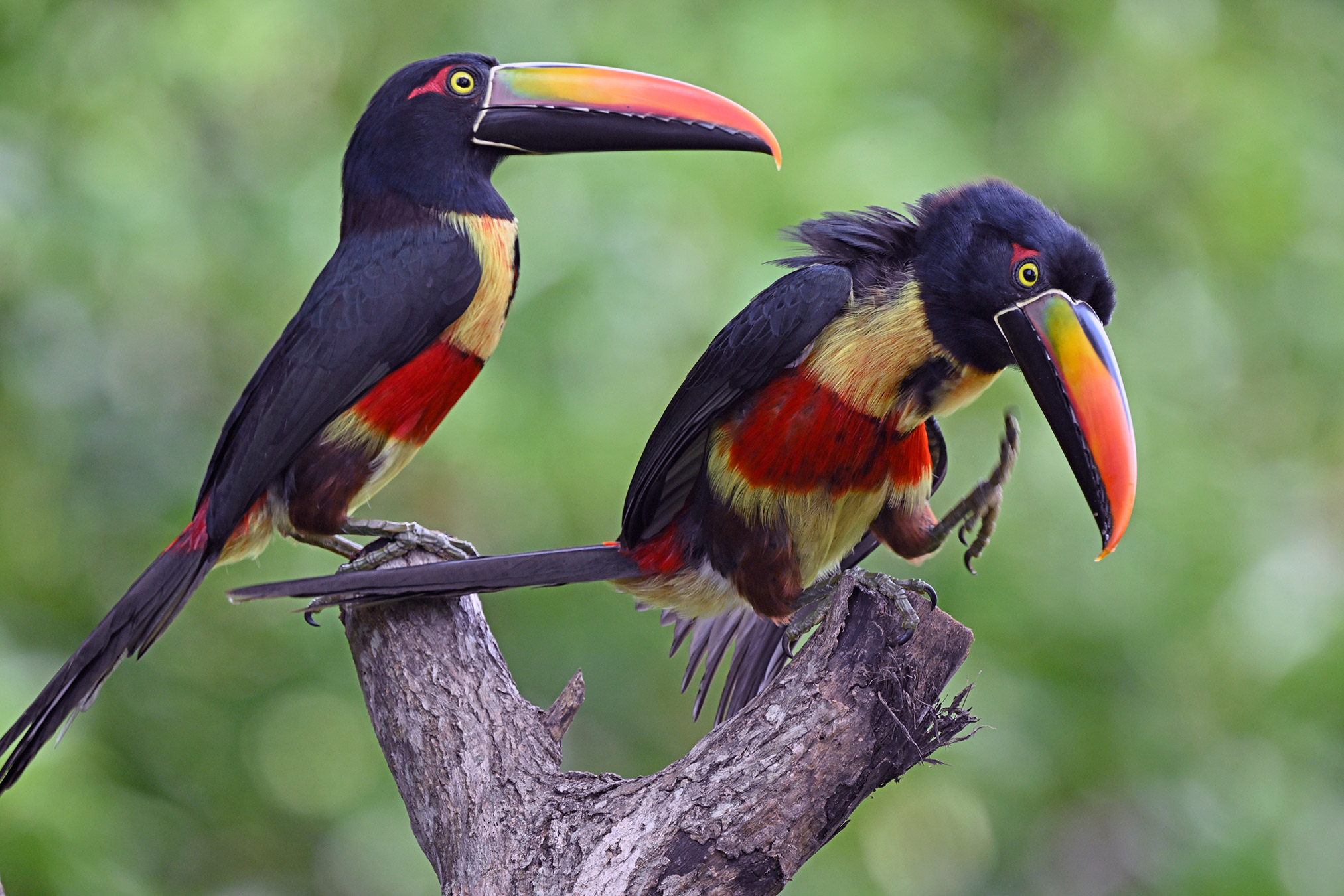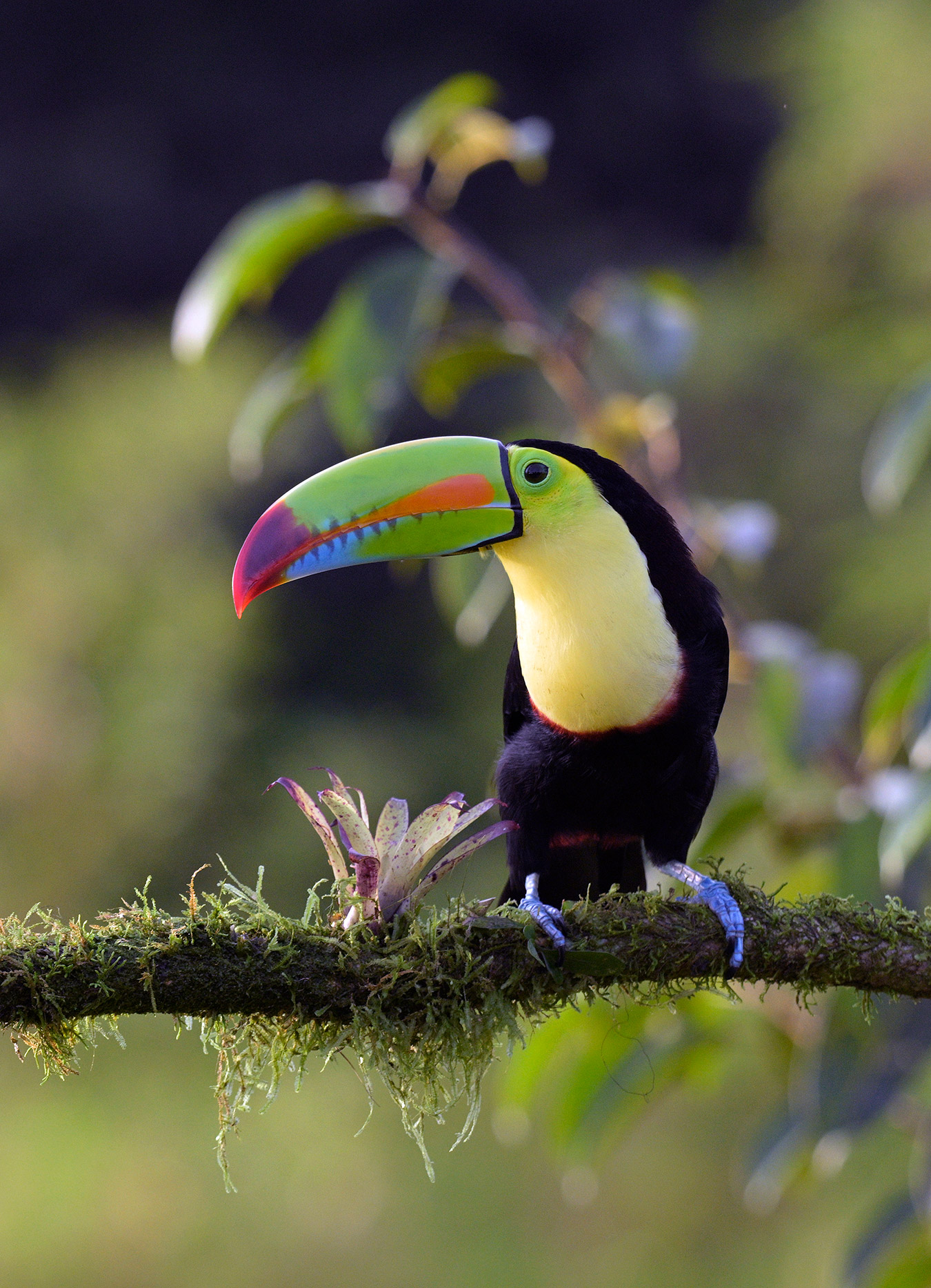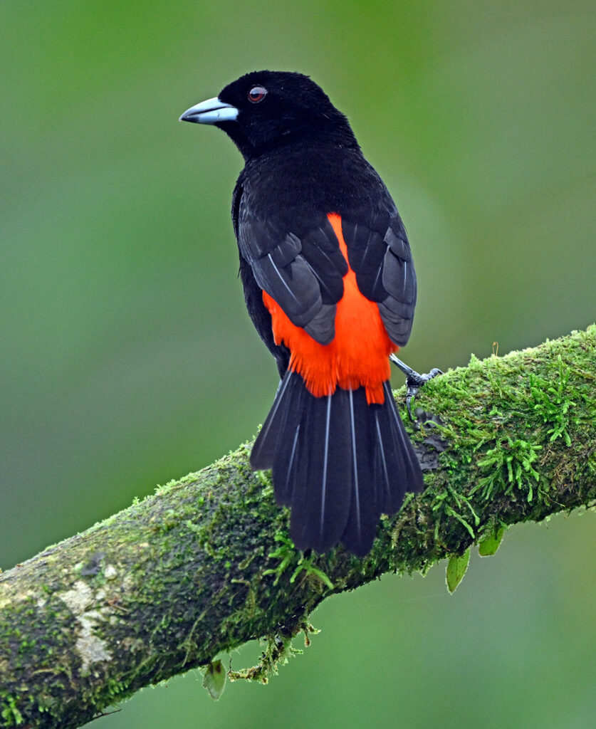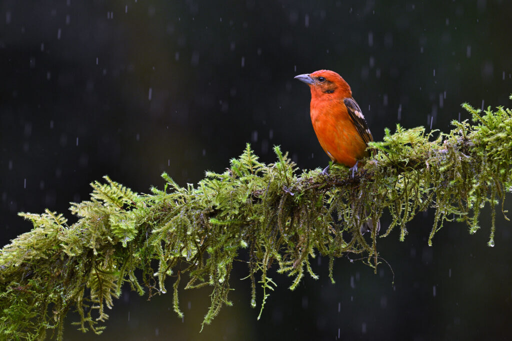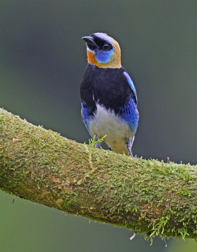 For my first trip to the tropics (outside of Mexico and the Caribbean) I was blessed to be able to join John Crawley and his family for a 10-day tour of Costa Rica, in search of the iconic birds and critters of this most hospitable Latin American country. The trip started with a bang…. toucans, parrots and king vultures at the well known Laguna Lagarto Lodge near the Nicaragua border. Tropical birds love bananas, and many ecotourism lodges present a breakfast platter of banana clusters and perhaps mangoes and other treats. Adjacent, attractive mossy perches are typically refreshed daily to create new looks for birds queuing up for their turn on the banana cluster. A variety of songbirds would stage here too, yet the large branches were overpowering for such small bodies. Fortunately, there was a lovely native tree next to the feeders where the smaller birds would stage and this is where I like to make magic…. birds immersed in native tropical vegetation.
