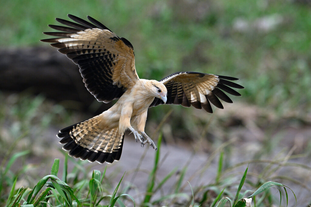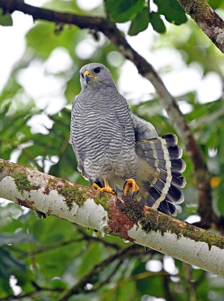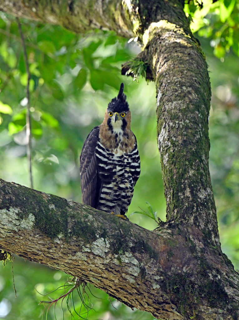 Speaking of birds of prey, we had a really nice wing stretch from a lovely gray hawk perched in a huge tree near the feeders. Now we know why we didn’t see that many songbirds staging for the bananas that morning. John’s grandson, an avid birder and photographer, has great eyes and was the first to spot the hawk calmly perched above the feeders. We actually got a double, alternating wing stretch in even light. While loading up for the bus one of the Lodge guides reported an ornate hawk eagle just down the trail… I was gathering gear within a second. The hawk is simply stunning beyond words. Again, the raptor calmly perched while we worked different angles, very unusual for a bird of prey. Apparently lightning can strike twice.