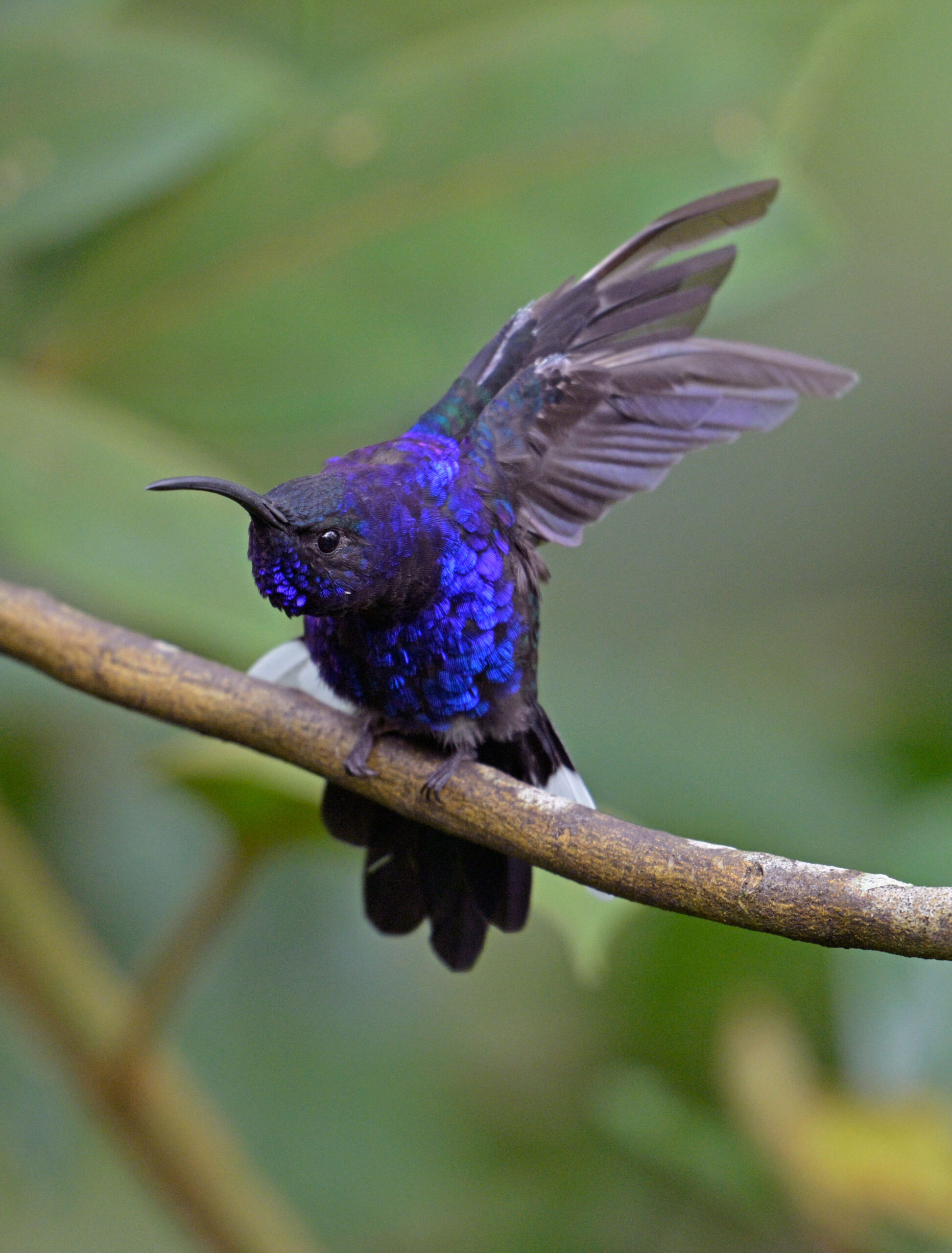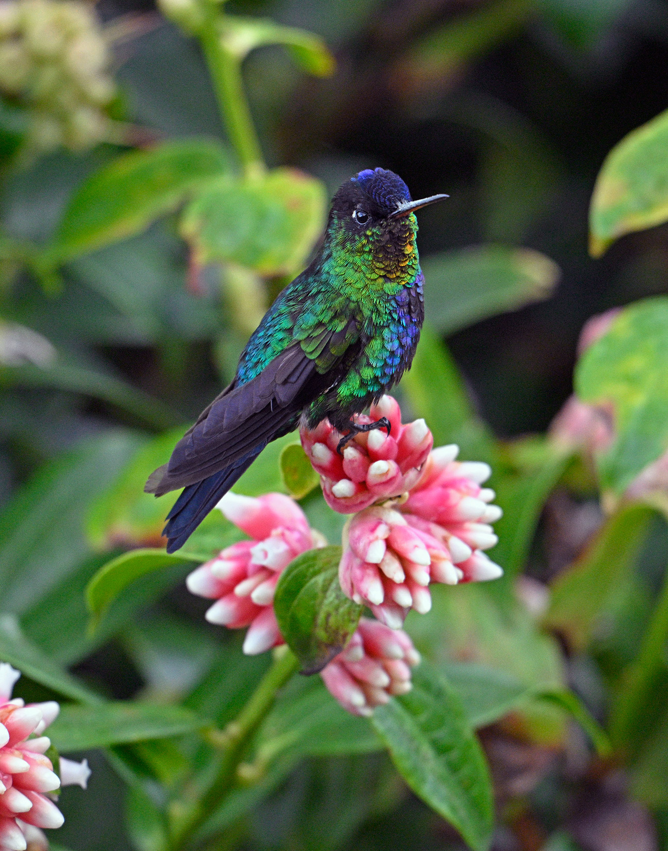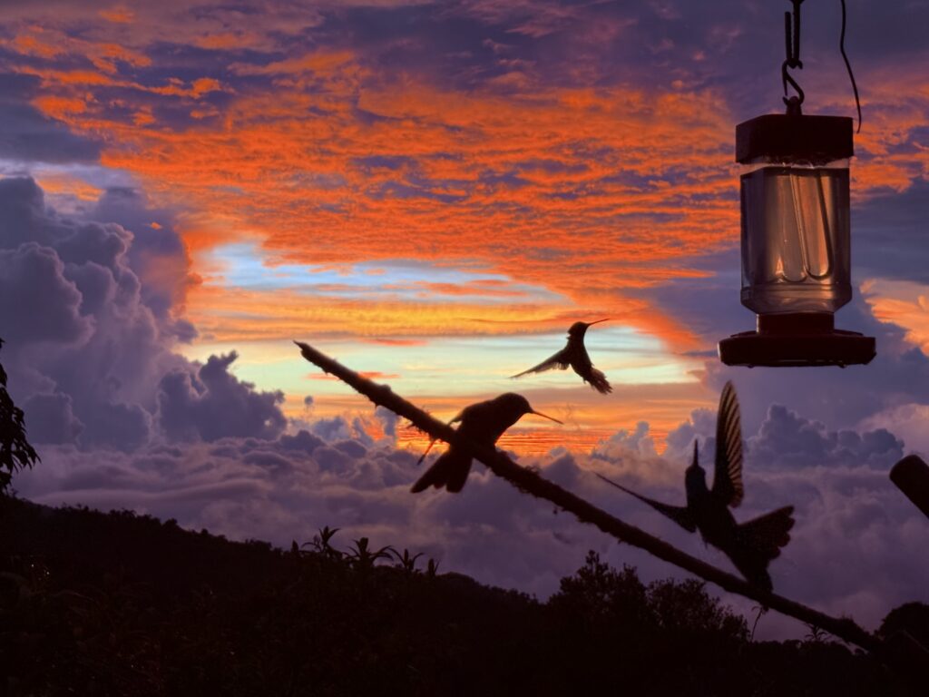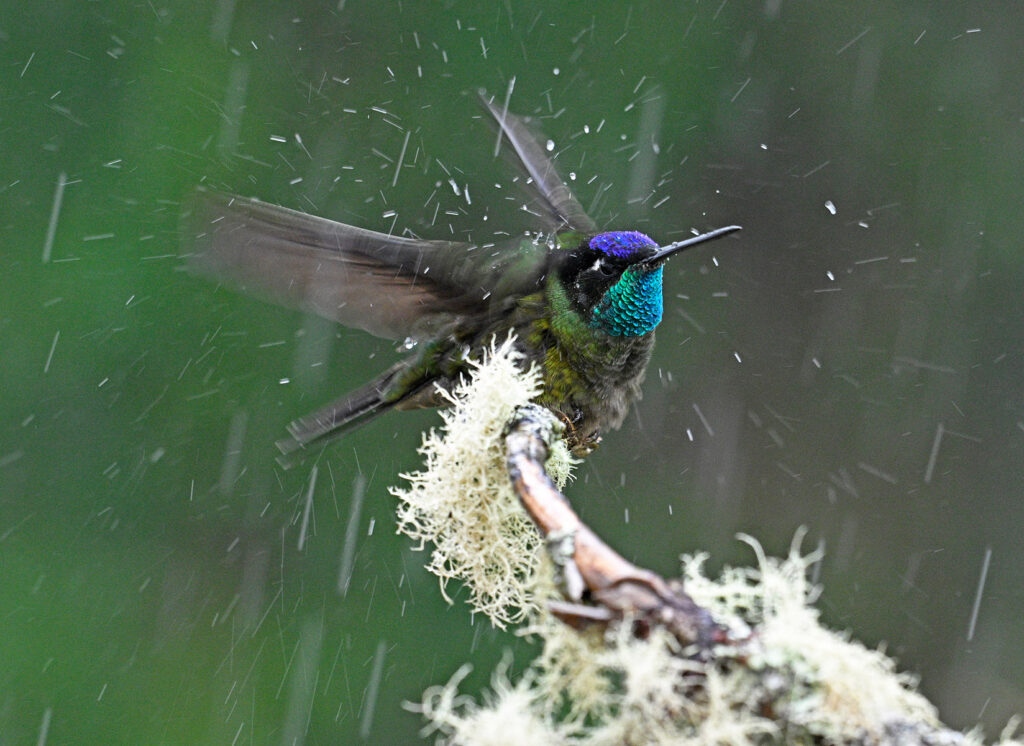 Our next destination was the world famous Quetzal Lodge, and it did not disappoint! High in the cloud forest, the temperature dropped maybe 30 degrees from our morning shoot in the valley. The grounds are spectacular, and the cabins have dramatic views of the lowlands and clouds hanging below. It’s a world unto itself. The grounds are covered with flowering trees, bushes and plants that attract many specimens of the few hummingbird species that live at these extraordinary altitudes. I’ll never forget hanging out with a poor Talamanca hummingbird that got caught in a rainshower. He would shake out his feathers every 30 seconds  to stay warm and dry, but it was a losing battle. I love the droplets jumping off his wings juxtaposed with the raindrops. Poetry in motion.