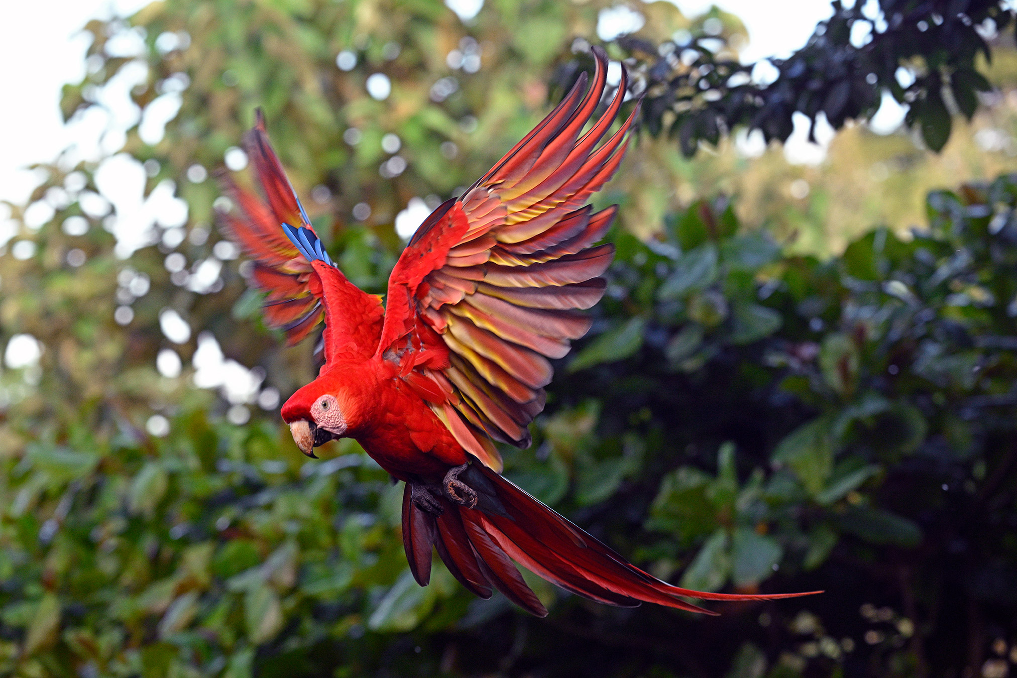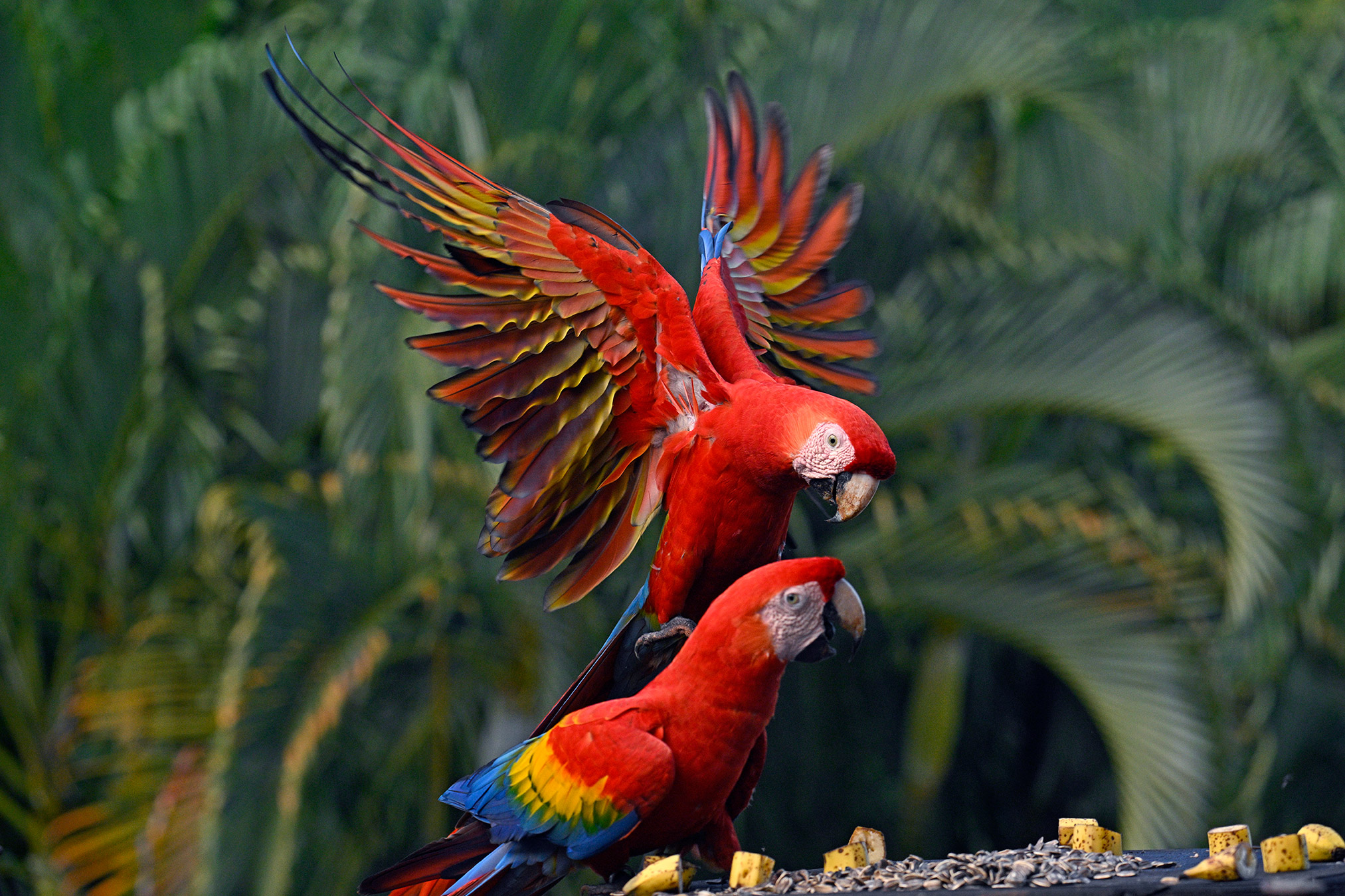 At our last lodge, whose name escapes me now, I received the cherry on top of the ice cream sunday…. close-ups of the scarlet macaw! Throughout the trip they were commonly seen, but never at close range. The second to last day I staked out the deck where food is placed out. Several species came in for breakfast, but no macaws. The very last morning I kept on prodding the waitress to put the food out but it seemed like she didn’t understand. While eating my own breakfast, she must have slipped out the bananas, as I saw the giant red birds approach. Fortunately this pair of friendly wild macaws, named by the waitress, made repeated flights into the feeder for dynamic flight shots and plumage close-ups. Wow… a perfect ending to a most memorable trip!