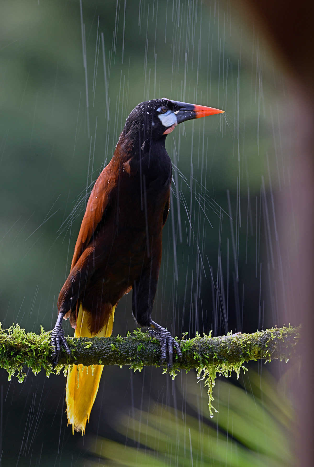 Back at Cope’s house is one of the most delightful feeding stations I’ve ever seen. A covered porch with seating and a long bar for drinks and fresh fruit sits within feet of an astonishing array of feeders attracting all sorts of birds, including a lovely stream that is rife with activity! Even though it was dark due to the rainy conditions, floodlights were turned on to provide just enough light to shoot non-action pictures. Magic happens at Cope’s! A paid of orange-chinned parakeets shared a kiss, the only hummingbird species with red feet gave us stellar views perched at minimum focus, a basilisk lizard commanded the stream, red-legged honeycreepers got all lovey dovey, a pair of russet-naped wood-rails mated by the stream, and a chestnut-headed oropendola repeatedly fed its rambunctious chick, now able to fly. Over two days we must have photographed at least 25 species in Cope’s suburban oasis.