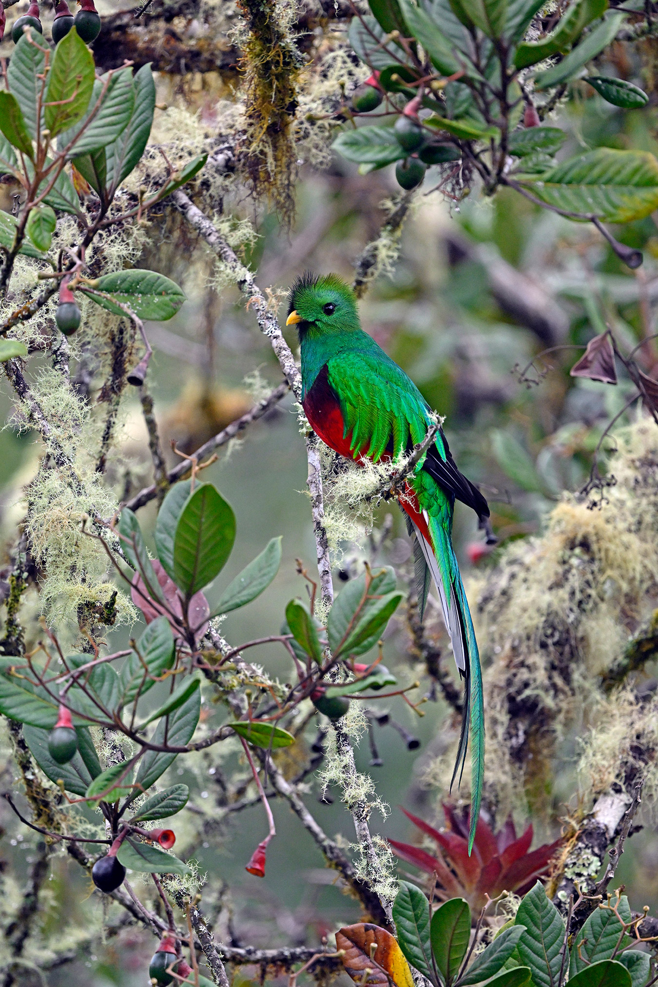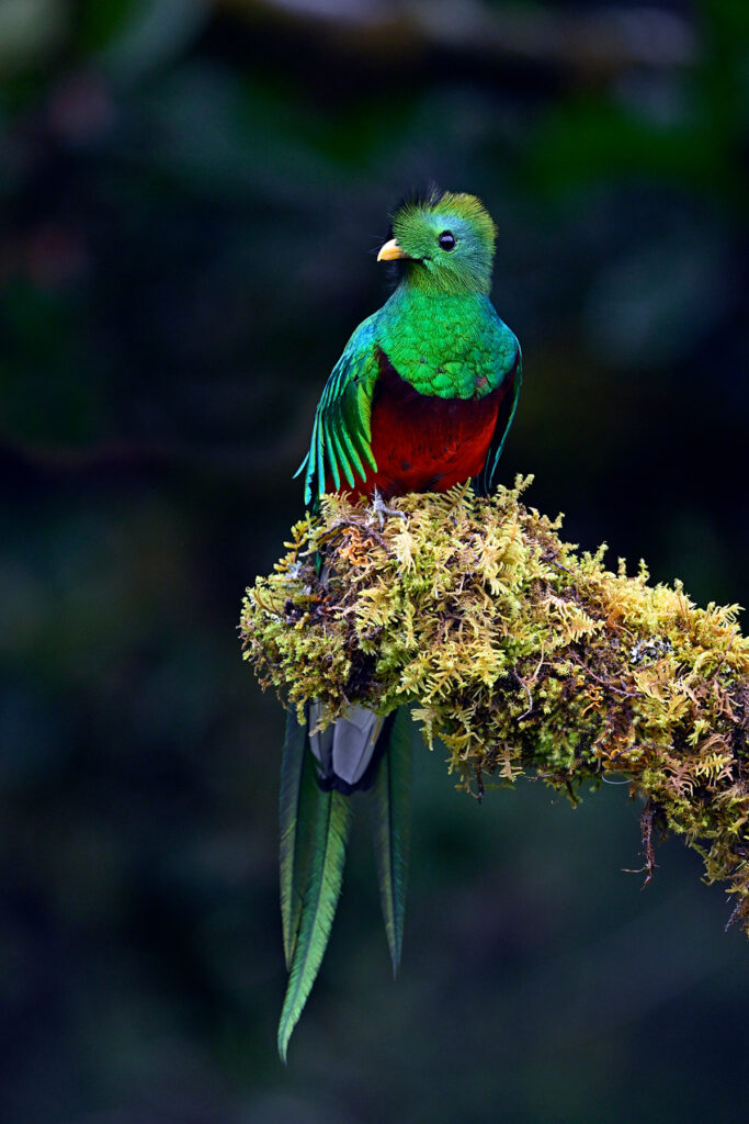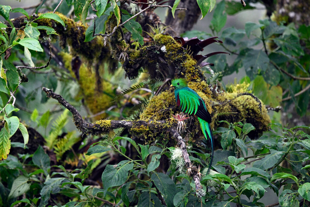 Of course the highlight of any trip to Quetzal Lodge is to see the mythical ResplendentĀ Quetzal, arguably one of the world’s most captivating birds. While these large birds are entrenched in the cloud forests, seeing one calls for a little advance planning. Our tour leader, Jeffrey Munoz of Rainforest Tours, clearly did his homework, as we took a 20-minute bus ride to a little farm in theĀ cloud forest that is ground zero for Quetzal photography. A comfortable open air blind at the top of the hill provides a splendid view of an old wild avocado tree that is quite enticing to the local Quetzals. That afternoon we wereĀ treatedĀ to maybe six fly-ins of maybe four different individuals. Attractive moss-covered staging perches were placed strategically and all four perches were used! My favorite moment was when a stunning male perched in a nearby tree laden with greenery for a sublime habitat shot. Quetzals are simply out of this world! While packing up to leave our mountain retreat, John spotted a close-up long-tailed silky-flyctacherĀ right next to the Lodge, and this one wanted to have his picture taken, multiple views please! Another gem from Costa Rica!Ā