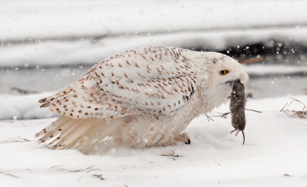 Of the 12 owls we saw over a week, 2 were exceptionally friendly and made the entire trip quite worthwhile. The Salisbury, Mass male put on a great show, especially on the one day that it snowed hard all morning. We watched him catch 5 voles in about an hour, including one poor little fellow that was swimming for high ground with the tide coming in. The owl plucked him out of the water osprey-fashion and then beheaded him…. just remember when you think that you are having a bad day!