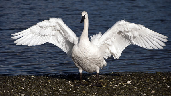 Esquimalt Lagoon is also home to swans, mostly the orange-billed Mute Swan, a native of Europe. Several pairs were engaged in courtship display, arching their angelic white wings over the back. In one split second, the heads of one pair crossed to form a heart, a most fitting symbol for these lovebirds! A lone Trumpeter Swan also winters on the lagoon, and he gave me a glorious wingflap sequence while preening on the beach. I love all the detail in the whites, something that digital photography highlights beautifully.